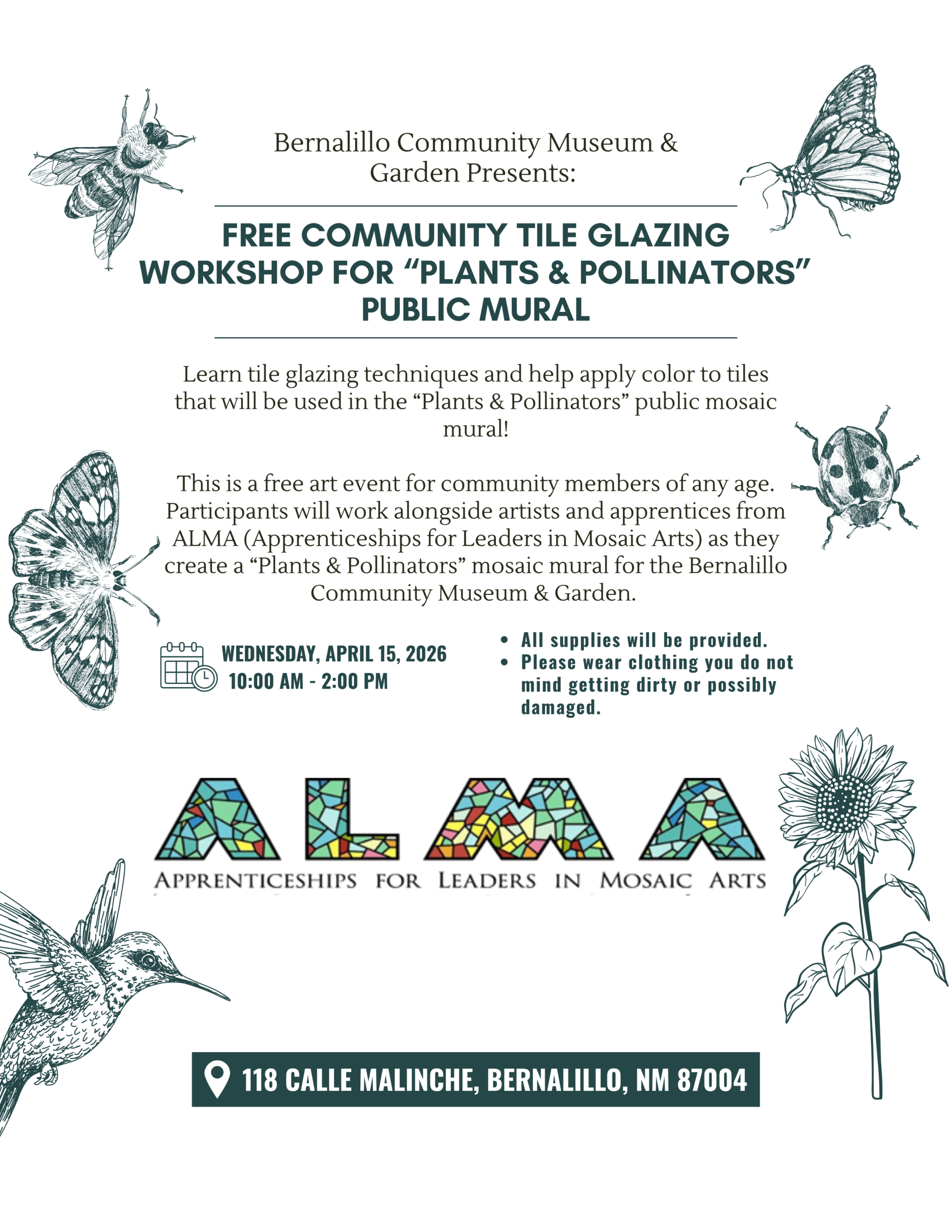 «Return to Events List | Museum EventBernalillo Community Museum & Garden Presents: FREE Community Tile Glazing Workshop for “Plants & Pollinators” Public Mural
